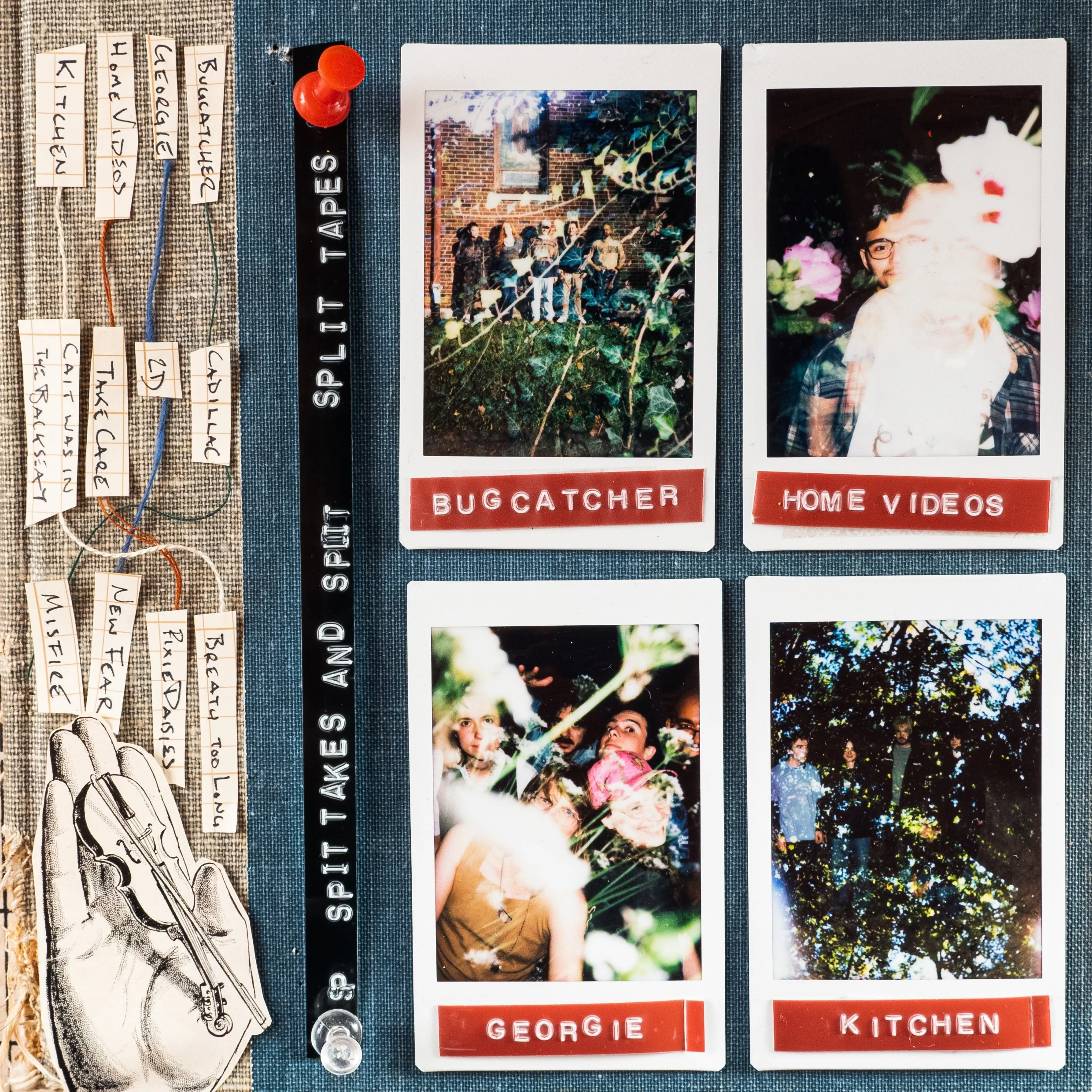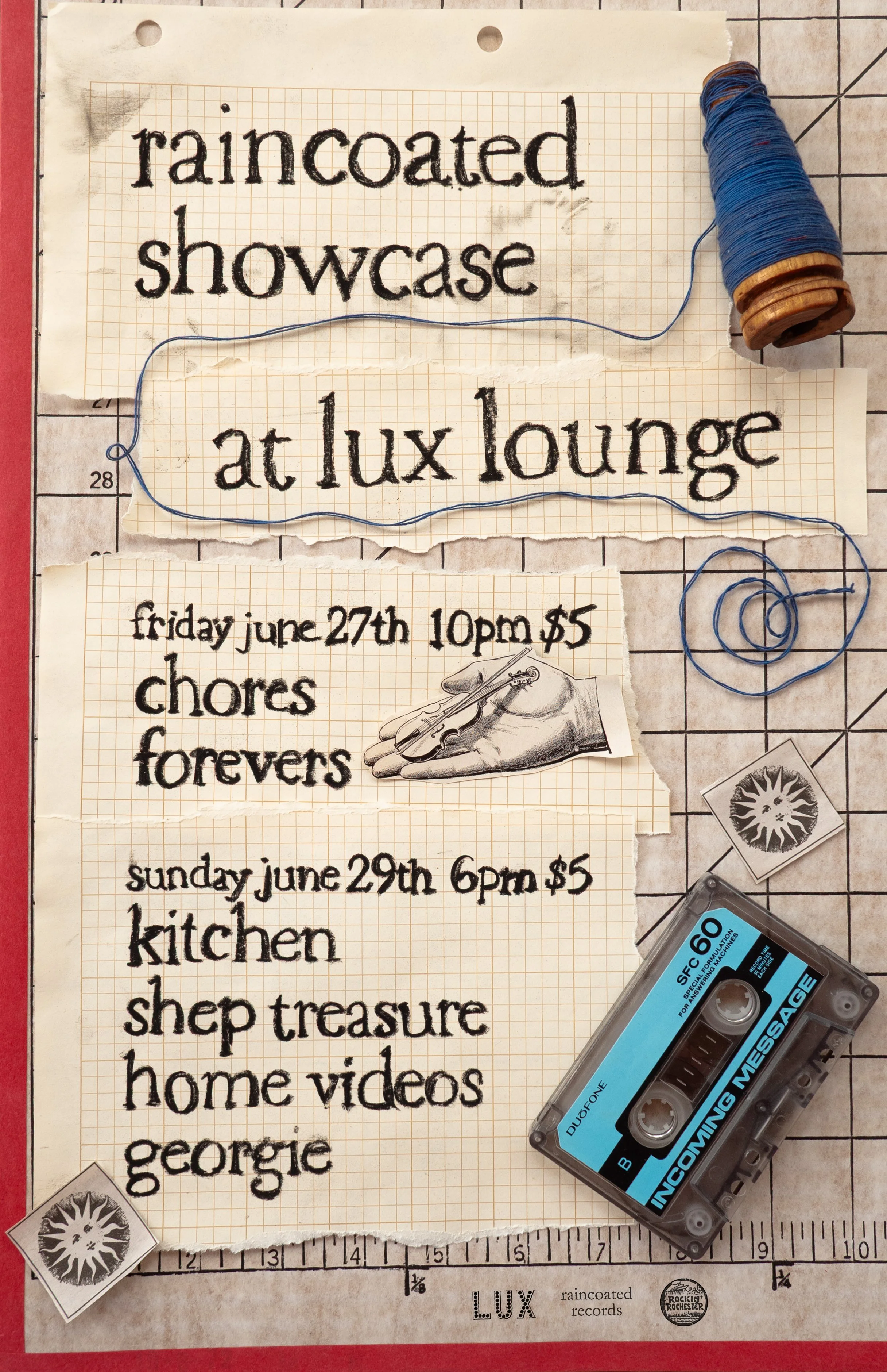Mixed-media flyer designs, cassette layouts, and album art.